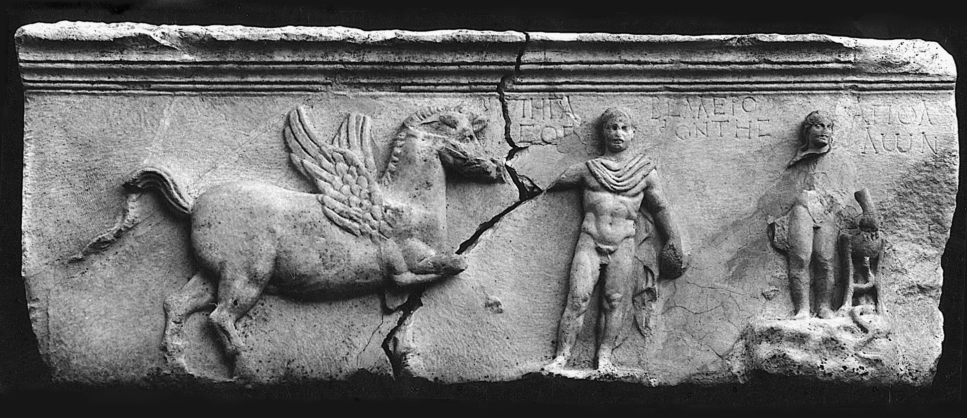 Figure 2. Relief panel in the civil basilica at Aphrodisias depicting Bellerophon, the mythological founder of Aphrodisias, together with his horse Pegasus and Apollo (late first century C.E.)