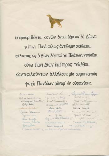 A lifelong lover of dogs, Panofsky was surprised when the entire Institute community got together to get him an Irish Setter puppy after his previous dog died. He was presented with a scroll in Greek, with the signatures of all the community members who participated in the gift. The poem, translated into English, reads: