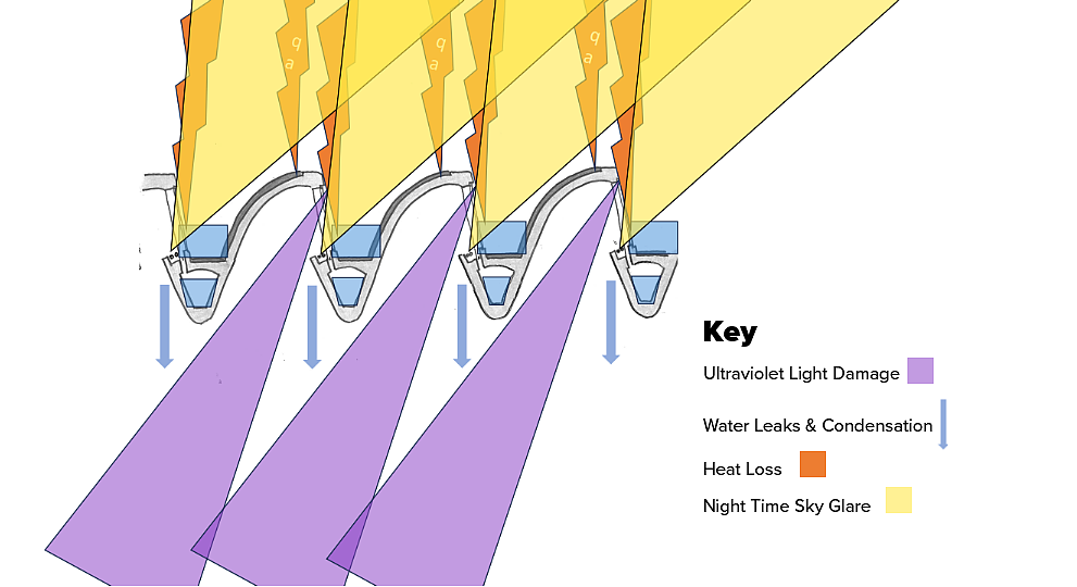One of the most concerning failures is its susceptibility to the elements. The glass skylights are set deep into the valleys formed by the curved beams. The glass is set directly into the concrete. During rainstorms, the valleys fill up; rising water infiltrates under the glass, through cracks into the concrete beams, into the ducts, and down to the library below. On other days, condensation forms on the single pane glass, dripping into the ductwork and through concrete. There is not enough depth in the beam design to accommodate window frames or double glazing. Repeated replacement of the waterproof roofing in past years was not able to prevent leaks because it could not solve the fundamental geometric design problem of the placement of the glass at the bottom of the valleys.