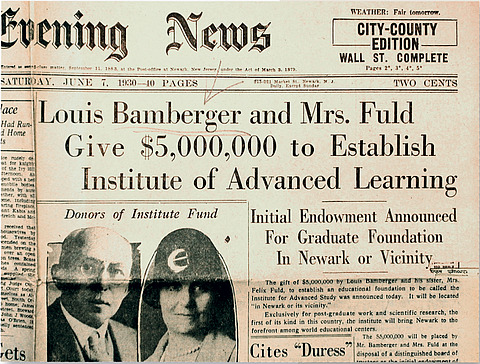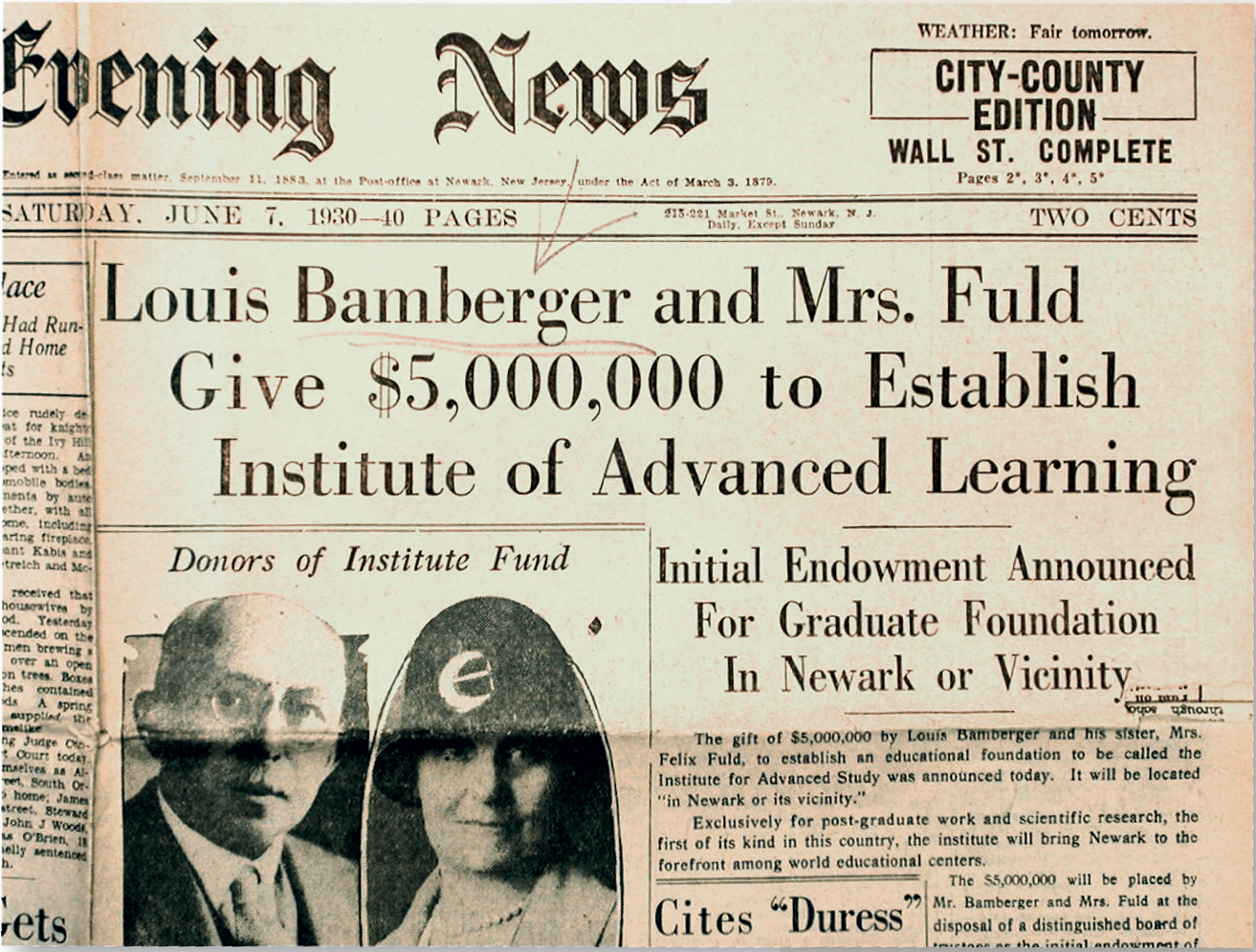 On May 20, 1930, a certificate of incorporation for the “Institute for Advanced Study—Louis Bamberger and Mrs. Felix Fuld Foundation” was filed with the State of New Jersey. Brother-and-sister philanthropists Louis and Caroline Bamberger provided the founding $5 million gift to establish an institution dedicated to the vision of education reformer Abraham Flexner, the Institute’s founding Director: