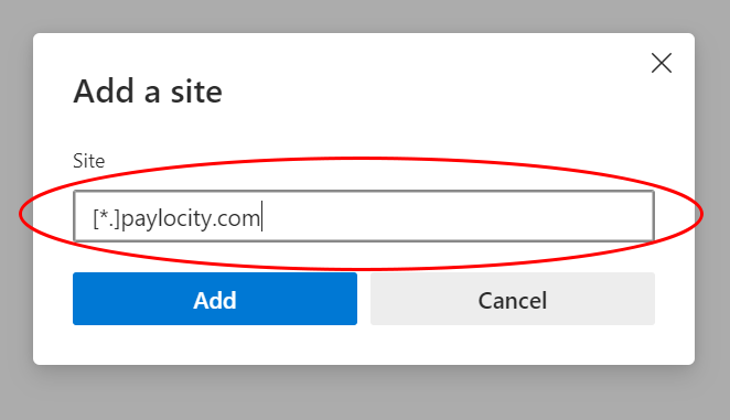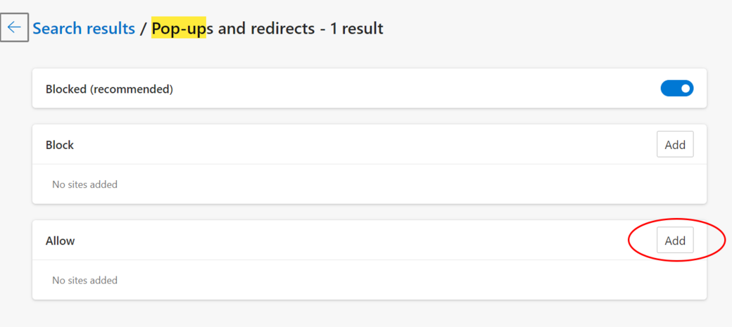 Select "Add" to the right of the header "Allowed to send pop-ups and use redirects"