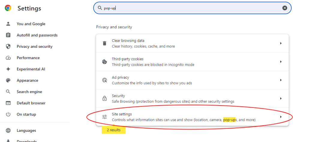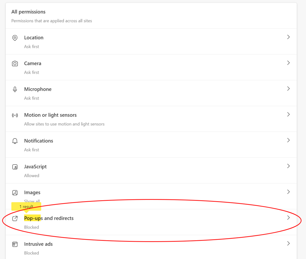 Below the search bar, select "Exceptions..." to the right of "Block pop-up windows"