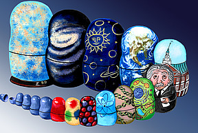 The artwork by Robbert Dijkgraaf, Director and Leon Levy Professor, depicts Russian nesting to capture the different scales of knowledge about the natural world, from the largest matryoshka doll that depicts our universe through the cosmic microwave background, the “first light” emitted soon after the Big Bang, to the smallest doll, the Planck scale, where spacetime becomes a quantum phenomenon.