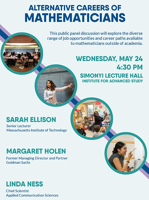 The talk will explore the diverse range of job opportunities and career paths available to mathematicians outside of academia featuinge a discussion led by Sara Ellison, Senior Lecturer at the Massachusetts Institute of Technology and Member (2003–04) in the School of Social Science, Margaret Holen, former Managing Director and Partner at Goldman Sachs, and Linda Ness, Chief Scientist at Applied Communication Sciences and Visitor (1977–78, 1982) in the School of Mathematics.