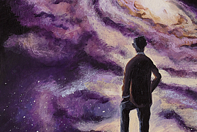 a cartoon of a boy, lying on his side on the lawn, reading a book