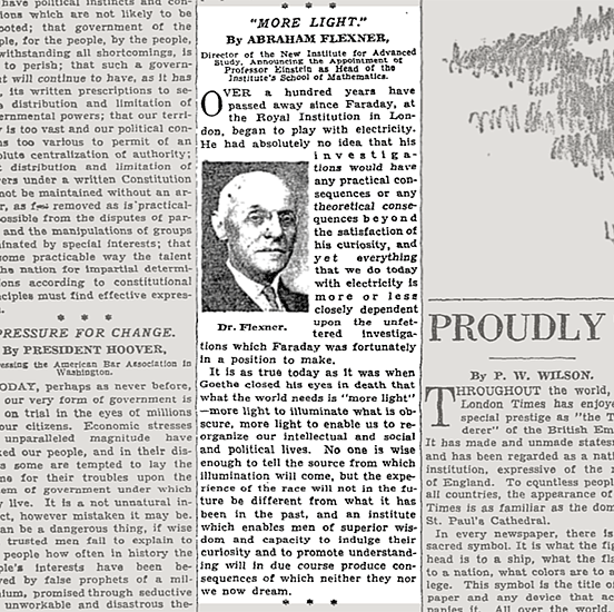 The following text, from founding Director Abraham Flexner’s announcement of the appointment of Albert Einstein to the Institute's inaugural Faculty, was published in the New York Times on October 16, 1932.