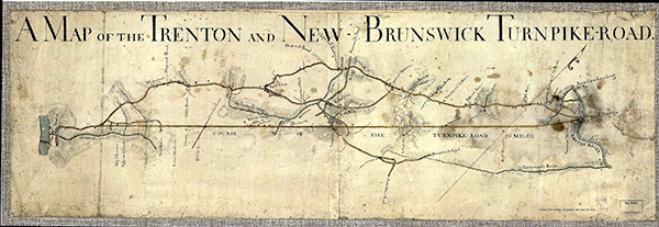 To the west of Pennsylvania lay open wilderness, while to the east the wilds of New Jersey began to be squeezed between two growing populations centered upon Philadelphia and New York. The most direct connection between the two settlements was overland across the “waist” of New Jersey, between the head of navigation on the Delaware River (near present-day Trenton, upstream from Philadelphia) and the head of navigation on the Raritan River (near present-day New Brunswick, upstream from New York). This well-worn Lenni Lenape footpath became, in succession, a trail passable by horses, a wagon road, the “King’s Highway” for stagecoaches, and finally State Routes 27 and 206.