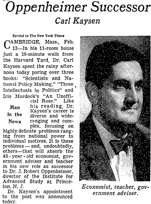 As you all know, Carl was in a bad situation at Princeton when he established the School of Social Science at the Institute for Advanced Study. Some Institute mathematicians had never forgiven the Institute Trustees for appointing Robert Oppenheimer as Director twenty years earlier. They decided to take their revenge on Carl. They organized a noisy public campaign against Carl, rather like the campaign of the tea-party Republicans against Obama. I was asked by the Institute Trustees to write a statement of my views, and here is the gist of what I wrote. “Carl Kaysen is as good a Director as we are likely to get and better than we deserve. He has made great efforts under difficult conditions to establish a first-rate program in social science. . . . During the nearly twenty years that I have been a member of the Faculty, a number of my colleagues have been slandering, harassing, and intriguing against the Director. It seems to make no difference who the Director is or what he is trying to do. ... I cannot take seriously the pretensions of the Faculty to collective wisdom in the governance of the Institute. For twenty years our Faculty meetings have been distinguished by an astonishingly low level of discourse. ... The Director is doing his job well, and will continue to do so provided that the Board continues to support him. Our internal problems are not worth more than twenty minutes of a busy man’s time.”