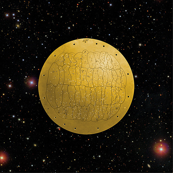 The SDSS uses a dedicated telescope (located in New Mexico) with a 2.5-meter-diameter mirror, similar in size to the Hubble Space Telescope’s, but much smaller than those of the largest ground-based telescopes (whose mirrors are eight to ten meters across). What makes the SDSS special are the exceptionally powerful instruments on the back of the telescope. The first is a giant digital camera—the largest in the world at the time it was built—which has taken deep, multicolor images that cover more than half the northern-hemisphere sky, detecting over 100 million galaxies and 200 million stars. But to measure the distance to a galaxy or the velocity and chemical composition of a star, one has to disperse its light through a prism and identify the fine features etched on its spectrum by individual species of atoms, a kind of observation that astronomers have traditionally done one object at a time. The SDSS took this three-dimensional mapping into mass production by feeding its spectrographs with 640 optical fibers, plugged into 640 precision-drilled holes on a thirty-inch aluminum plate, each hole admitting the light from a single preselected galaxy, star, or quasar. After eight years of operations and more than 2,600 plates, SDSS I and II had measured spectra of nearly one million galaxies, more than one hundred thousand quasars, and half a million stars.