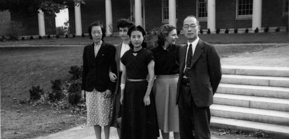 Mathematical physicist Cécile DeWitt-Morette (second from right) accepted IAS Director J. Robert Oppenheimer’s invitation to work among a group of young physicists under his supervision. In this 1948 image, she is seen with Nobel Laureate and physicist Hideki Yukawa (far right) and his wife Sumi (center), alongside physicists C. S. Wang Chang (left), who founded and led the first Chinese research group on controlled thermonuclear reactions, and Sheila Power (second left), believed to be the first Irish woman to receive a doctorate in the mathematical sciences.