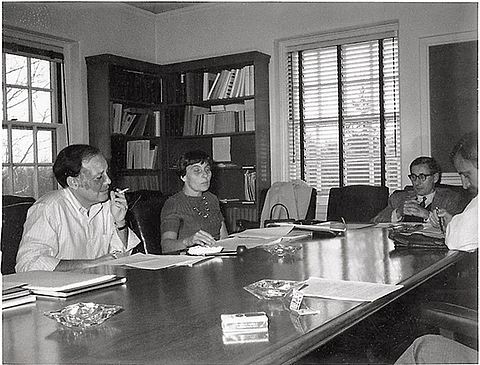 Cécile DeWitt-Morette with (from left to right) Isadore Singer, Freeman Dyson, and Raoul Bott at the Institute in the 1950s