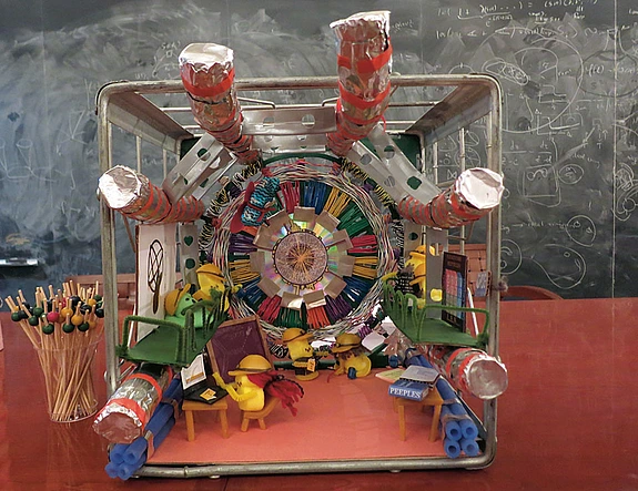 The party was probably unique in the history of the Institute—no one could remember another occasion when its physicists quaffed champagne and speared Italian-style macerated strawberries after a seminar beginning in the middle of the night. Renée Hlozek, an astrophysicist at Princeton University, brought cookies decorated with a symbol denoting the Higgs field. On loan from Marilena LoVerde, a Member in the Institute’s School of Natural Sciences, and Laura Newburgh, a physicist at Princeton University, was a diorama of CERN’s huge ATLAS particle detector, delicately crafted from Peeps (marshmallow candies with hardened sugar shells), as well as paper and items molded from wax, held together with sticky tape.