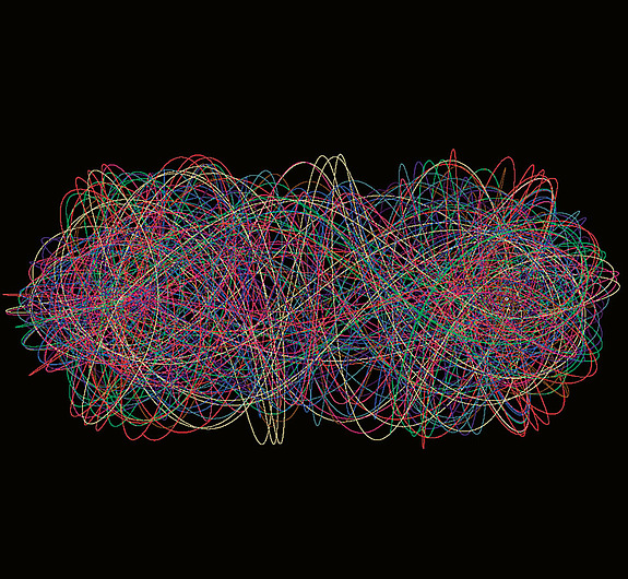 Not long before, in my 2010 inaugural public lecture at IAS, “From Celestial Mechanics to a Geometry Based on the Concept of Area,” I had described the historical background and some of the interesting mathematical problems belonging to this anticipated field of symplectic dynamics. The lecture began with a computer program showing chaos in the restricted three-body problem. This problem describes the movement of a satellite under the gravity of two big bodies, say the earth and the moon, in a rotating coordinates system in which the earth and the moon stay at fixed positions. The chaos in the system is illustrated by putting about ten satellites initially at almost the same position with almost the same velocity.