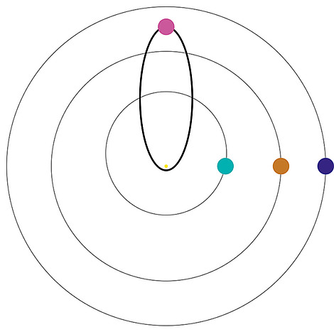 | Figure 3: Depiction of high-e migration of HD 80606b (magenta). The outer ellipse corresponds to a planet with HD 80606b’s orbital angular momentum, but with an orbital period of twelve years, equal to that of our Jupiter. The sequence of ellipses of diminishing eccentricity illustrates how tidal dissipation at closest approach to the stellar host slowly removes orbital energy, shrinking the orbit, but conserving angular momentum. At the end of its migration, HD 80606b’s orbit will be the small circular orbit, with a final period equal to 5 days. For reference, the orbits of the inner three planets of our solar system are shown. |