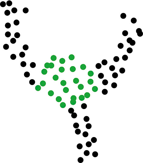 The problem of studying tendrils in data is closely related to the problem of studying clusters. To see this, consider Figure 8, where the points in the central core of the data in Figure 5 are shown in green.