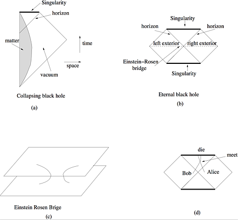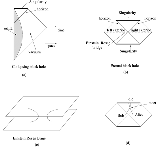 Outside of the distribution of collapsing matter, black holes are described by a spacetime solution found by Karl Schwarzschild in 1916. This solution turned out to be very confusing, and a full understanding of its classical aspects had to wait until the 1960s. The original Schwarzschild solution contained no matter (Figure 1b). It is just vacuum everywhere, but it has both future and past singularities. In 1935, Einstein and Nathan Rosen found a curious aspect of this solution: it contains two regions that look like the outside of a black hole. Namely, one starts with a spacetime that is flat at a far distance. As we approach the central region, spacetime is deformed with the same deformation that is generated outside a massive object. At a fixed time, the geometry of space is such that as we move in toward the center, instead of finding a massive object, we find a second asymptotic region (Figure 1c). The geometry of space looks like a wormhole connecting two asymptotically flat regions. This is sometimes called the Einstein–Rosen bridge. They realized this before the full geometry was properly understood. Their motivation was to find a model for elementary particles where particles were represented by smooth geometries. We now think that their original motivation was misguided. This geometry can also be interpreted as a kind of wormhole that connects two distant regions in the same spacetime. John Wheeler and Robert Fuller showed that these wormholes are not traversable, meaning it is not possible to physically travel from one side of the wormhole to the other. [3] We can think of this configuration as a pair of distant black holes. Each black hole has its own horizon. But it is a very particular pair since they are connected through the horizon. The distance from one horizon to the other through the wormhole is zero at one instant of time. Let us consider two observers, Alice and Bob, outside each of the black holes. For a brief moment in time, the horizons of the two black holes touch, then they move away from each other. Alice cannot send a signal to Bob if she stays outside the horizon of her black hole. However, Alice and Bob could both jump into their respective black holes and meet inside. It would be a fatal meeting since they would then die at the singularity. This is a fatal attraction.