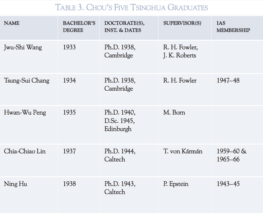 Nevertheless, Chou, a devoted mentor, nurtured many talented theorists over his tenure at Tsinghua, with J. S. Wang, T. S. Chang, H. W. Peng, C. C. Lin, and N. Hu standing out (see Table 3).23