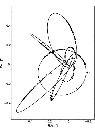 Our own galaxy also contains a black hole. Very close to the center of the Milky Way is a compact source of strong radio emission known as Sagittarius A*. High-resolution infrared observations reveal a handful of bright stars within a few hundredths of a parsec from Sagittarius A*. The positions and velocities of these stars have been tracked, some for as long as two decades; in particular, the star S2 has an orbital period of only 15.8 years and now has been tracked through more than one complete orbit (Figure 2). Using first-year mechanics, we can deduce from this orbit that the star is orbiting a body that is located at Sagittarius A*, that this body has a mass of 4.3 million solar masses, and that the size of this body is less than only one hundred times the Earth-Sun distance. This extreme concentration of mass is incompatible with any known long-lived astrophysical system other than a black hole.