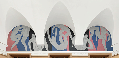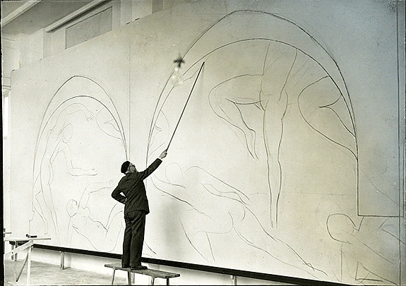 As I was pacing in front of my seventy-two square meters of white canvas destined to become the decoration of Doctor Barnes, not knowing which way to start, I noticed by chance a rope hanging from a window to a random spot in my studio, standing out and projecting a curve on my canvas. I suddenly had before me the relationship of this curve to the great rectangle of the edges of my decoration. This was the first connection with the surface to decorate, made of three pointed arches, and it is this unexpected connection that allowed me to begin taking possession of this large surface.