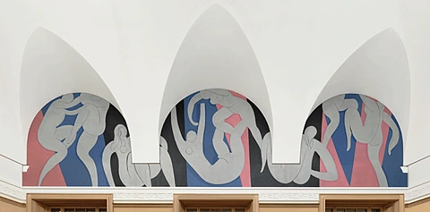 Matisse gave two separate accounts of the moment at which he began work on the first version of The Dance, each of them emphasizing the immensity of the surface he had to master, “to possess,” as he put it. In the first version, it is an architectural rhyme that triggers the onset of this sense of possession: