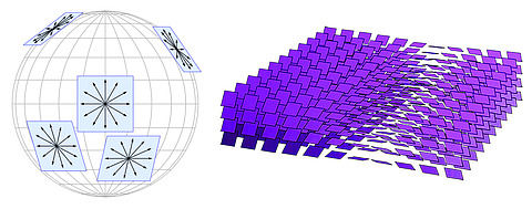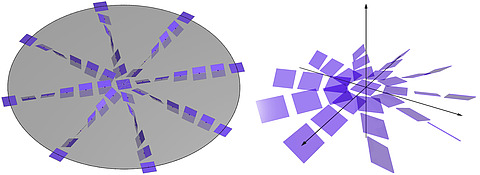 These are visualized in the z = 0-plane in Figure 5. Both ξstd and ξOT are horizontal along the z-axis and along any ray they both turn counterclockwise as one moves outward from the z-axis. However, the rotation angle of ξstd approaches (but never reaches) π/2, while the contact planes of ξOT make infinitely many complete turns.