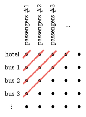 The next level is dealing with infinitely many infinite buses (each bus with infinitely many passengers). The first thing to do is to get everyone out of the hotel and out of the buses and organized in grid like form in the parking lot, or on a piece of paper: have the original guests of the hotel (a.k.a., passengers of bus 0) line up in order, left to right, forming a row. Have the passengers from the first bus form another row just below it, and the passengers from the second bus a row below that one, etc. Make the rows line up with each other so that passengers number 1 from each bus line up in a column, passengers number 2 line up in a column to the right of that one, and so on. Now, if we start filling up hotel rooms 1, 2, 3, 4, . . . with people from the first row, we will never finish it and move on to the second row, and similarly if we try to start with the first column. The trick is to think of diagonal lines, running bottom-left to top-right on the grid. The leftmost of these diagonal lines only hits the one top-left person (bus 0, passenger 1): put that person in room 1. The next diagonal line hits two people (bus 1, passenger 1 and bus 0, passenger 2): put those two people in rooms 2 and 3. The next diagonal line hits three people: put them in the next three empty rooms, 4, 5, 6. Continuing this pattern we will eventually assign a room to each of the people patiently standing in the parking lot.