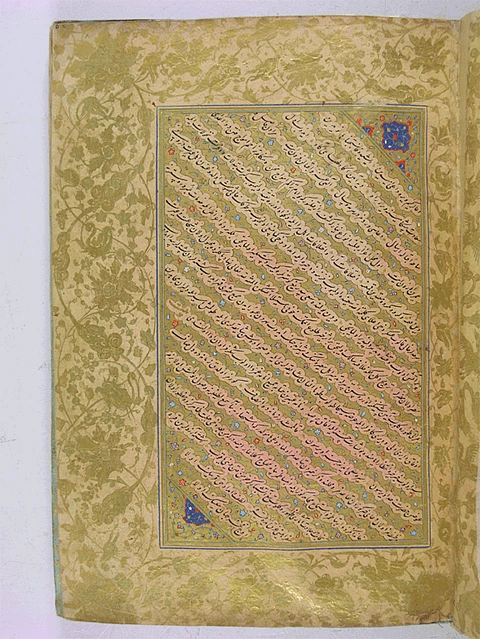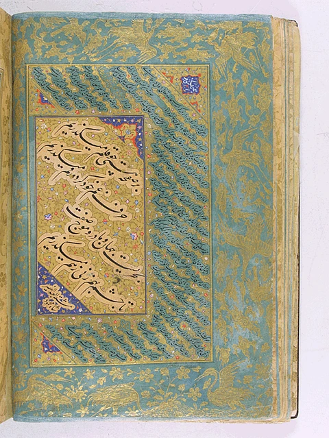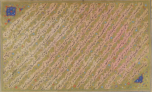 Sixteenth century albums such as the muraqqa’at-i Shah Mahmud-i Nishapuri of c. 1560, prepared for Sultan Süleyman (r. 1520–­1566) and currently in the Istanbul University Rare Book Library Collection, include exclusively Persian material, in this case calligraphy by the Safavid master of the nastaliq script, itself a script generally reserved for the Persian language, and closely associated with Iran. An album prepared for the sultan Murad III (r. 1574­–1595) from 1572, while including drawings by Ottoman court artists, privileges calligraphy from 15th and 16th century Persian calligraphers, again almost exclusively in the nastaliq script.8 The nastaliq samples in these albums are surrounded by Ottoman illuminations of bold florals which bring aesthetic unity to the materials they frame and locate them firmly in the Ottoman context, indeed marking the final product, the album itself, as Ottoman.