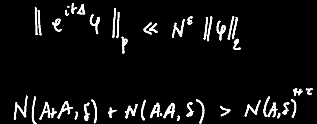 While he rejected outright the suggestion of a sixtieth birthday conference, a proposal to have a gathering occasioned by the publication of his 500th paper was not immediately dismissed —the conference “Analysis and Beyond: Celebrating Jean Bourgain’s Work and its Impact” took place at the IAS in Princeton on May 21–24, 2016. The conference talks (all of which were videotaped) are a tribute to the depth and breadth of Bourgain’s work and its singular and transcendent impact on the whole of our discipline. The beauty and power of the first result highlighted by Jean’s hand on the conference poster is apparent from reading the splendid paper by Andrea Nahmod in the Bulletin of the American Mathematical Society, 2016. The brief of this paper is to explicate the origins, nature, and development of the second result, the discretized sum-product inequality, in analysis and beyond.