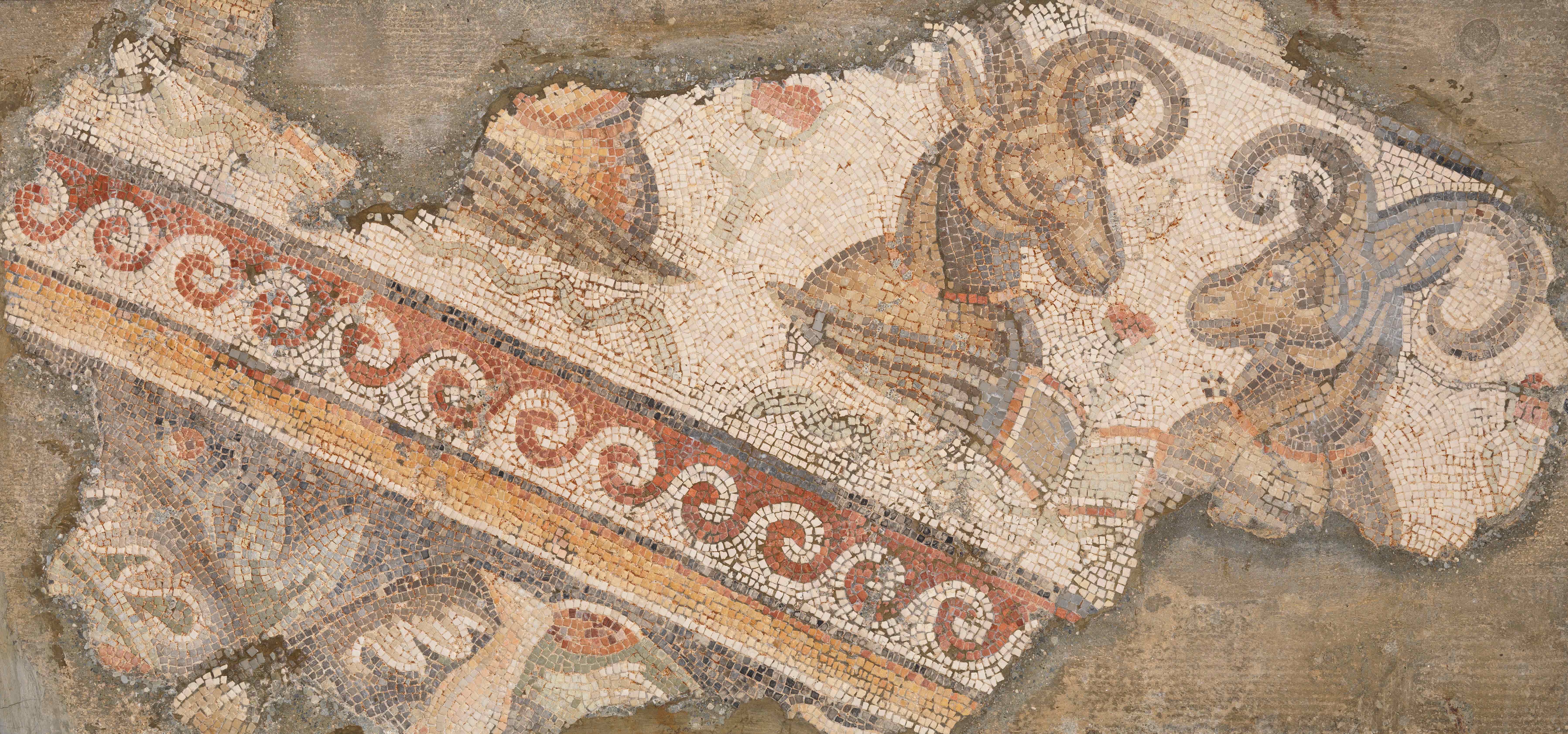 The rams’ heads rise behind a pair of outstretched wings. The central wing rib resembles an open codex (the ancestor of the modern book), the outer edge of each “page” outlined in red, with a white margin surrounding a central “text block” of green. A red flower on a green stalk rises from the spine like a bookmark, and a pair of grey-green ribbons float underneath; another flower, similar but larger, is visible to the left of the pair of rams. A comparable depiction of rams’ heads from the so-called House of the Phoenix, dated to the late fifth century, shows the wing ribs as two confronted “pelta” shapes (single crescents on the outside, double on the inside), which suggests that the codex between the wings of the Institute’s rams may be an extension of this stylized motif, rather than explicitly symbolizing a culture of the book. Rams’ heads are a heraldic symbol of royalty in Sasanian culture. Along with the pativ, they attest Persian influence in the décor of this part of the Roman Empire.