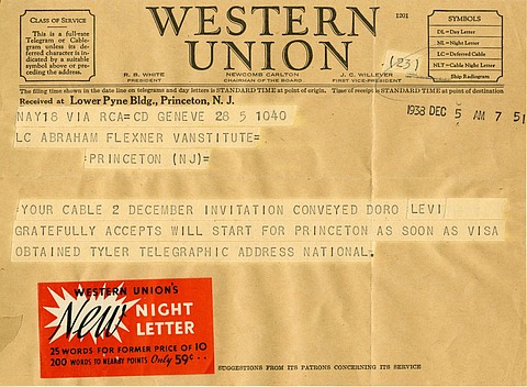 Levi was an eminent classical archaeologist who was forced to flee Fascist Italy. Thanks to the combined efforts of Abraham Flexner at the Institute, Robert Woods Bliss at Dumbarton Oaks, and Royall (“Peter”) Tyler at the League of Nations in Geneva, who was an art historian as well as an economist and a diplomat, Levi found a refuge at the Institute (Fig. 12). In between his two periods of Membership, he taught at Princeton University and at Harvard. He specialized in Greek, Etruscan, and Sardinian art and archaeology, and the eighty-five entries in his list of publications prior to his arrival in Princeton include nothing about mosaics. But the excavation diary for Tuesday, April 10, 1934, records that “Professor Doro Levi, of the Archaeological Museum of Florence, visited the excavations,” and in the Visitors’ Book a handwritten annotation for March 30 is immediately followed by Doro Levi’s card, carefully glued at the top of the next page.