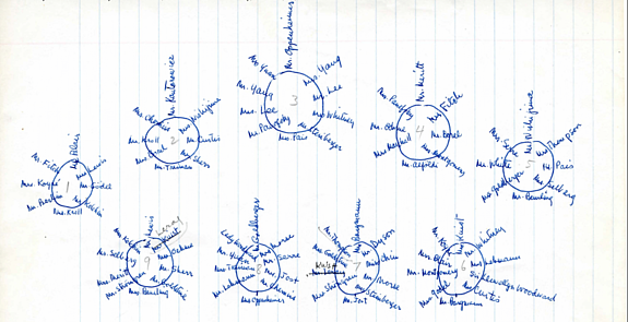 As Oppenheimer states in his conclusion, such architectures are not often globally useful; while they can foster connections, these connections are limited in their capacity to illuminate everything. Oppenheimer, though, is clearly not only arguing for dinner” as metaphor. Anyone who has spent time at the Institute will have experienced first-hand the significant connections that a meal can make. The Archives Center’s materials offer us a glimpse at the possible connections made here, through table arrangements and seating charts, which, in turn, offer us a glimpse at the far vaster network of intimacy and illumination of which we are a part.