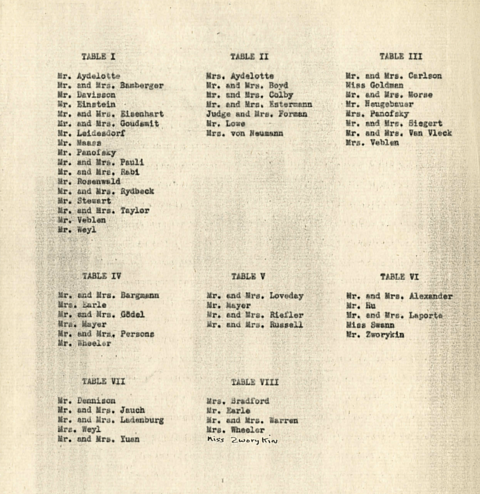 For instance, our records contain the preparations made by Frank Aydelotte, IAS Director (1939–47), for the dinner to celebrate Wolfgang Pauli’s Nobel Prize in Physics on December 10, 1945. The table arrangements preserved by the Institute’s Director’s Office even reveal the scholars seated among the table of honor. The tables provide a vision of the American pluralistic dream, the “melting pot (to use another food metaphor) at its best.