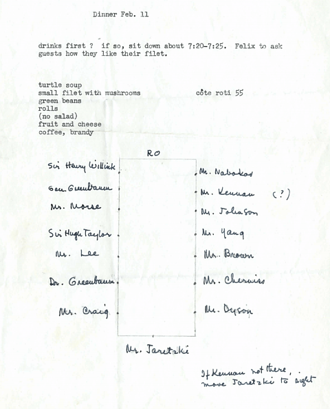 Oppenheimer’s dinners serve as significant records to document the guests of the Institute that often went otherwise unrecorded. Records from 1961, for example, reveal that Oppenheimer held a dinner in honor of Sir Henry Willink but extended a last-minute invitation to another guest: Vladimir Nabokov. Nabokov’s name appears in Oppenheimer’s own hand on a list of invitees and sits next to the Director at the head of the table, only a few months before he would leave the United States for Switzerland for good. The handwritten note is the only record of Nabokov’s visit to the Institute that remains in the IAS archives. The addition provides insight into the intimacies of Institute life, and, yet it raises that perpetual question at the center of Oppenheimer’s conclusion: What do we make of a universe in which seemingly everything might be connected with anything? Might we strive forever without truly making sense of anything?