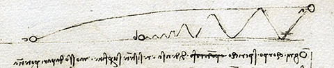 The second principle is embodied in Leonardo's illustration of two balls (corpo sperico) thrown with the same force, one a long distance, the other thrown toward the ground so that it bounces. In the accompanying text Leonardo notes that the two balls travel the same distance, that is, if the two trajectories were laid flat they would be the same length (Fig. 12).5