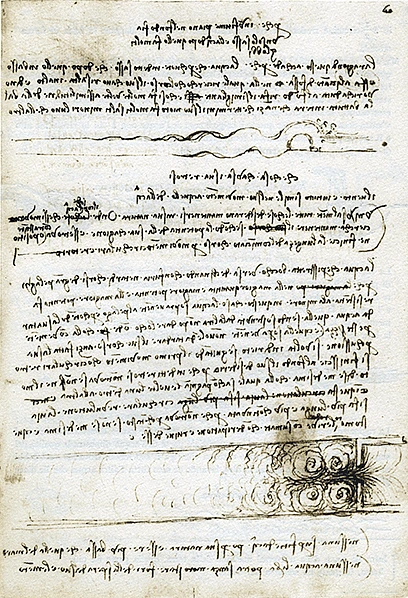 [1] L'onde che per contrari moti si sconterranno insieme, quella che fia in più basso sito seguirà suo corso sotto la più alta—L'acqua che con declinante movimento discenderà sopra grobbuloso fondo, fia di più veloce corso in superfizie che di sotto—Quel corpo di lieve qualità, il quale si troverà infra la percussione e la risaltazione dell'acque, mai muterà sito stando il flume d'equale movimento.—L'acqua di globbuloso fondo e di piana superfizie si moverà con più velocità in fondo che di sopra (MS A, fol. 24v, Brizio 1954, p. 281)