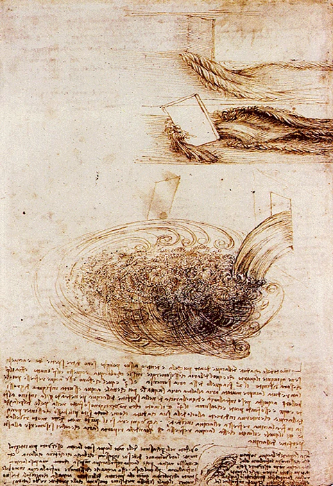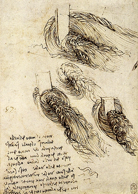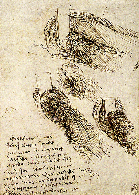 "Observe the motion of the surface of the water, which resembles that of hair, which has two motions, one of which depends on the weight of the hair, the other on the direction of the curls; thus the water forms turning eddies, one of which follows the impetus of the main course while the other follows that of incidence and reflection."3
