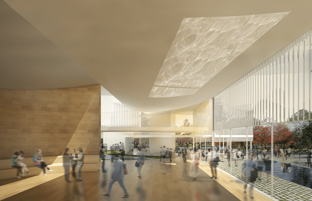 In fact, the concept of “intertwining” was central to the design proposal. For Holl, it has a two-fold meaning. First, it aims to intersect the sciences and the humanities, promoting exchange between different disciplinary silos. Second, intertwining fuses architecture and nature by treating light as a material and organizing the entire plan in sync with seasonal changes, turning the building into a fine-tuned horological instrument that registers light and space through time.