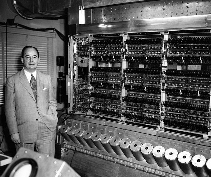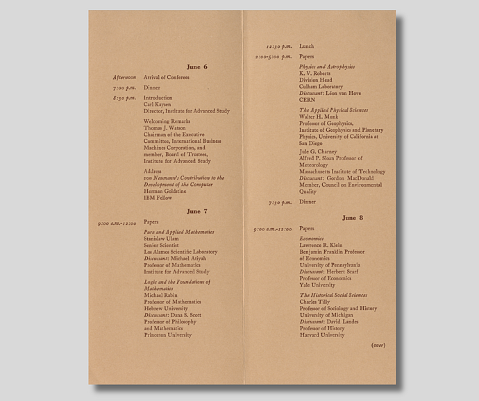 In May 1946, twenty years prior to Kaysen’s announcement, several of the Institute’s early scholars attended the first in a series of interdisciplinary conferences focused on applying tools from the physical sciences and mathematics to the biological and social sciences. For eight years, the Josiah Macy Jr. Foundation hosted this series of conferences, now known as the Macy Conferences, in New York City and Princeton. The conferences included John von Neumann, Professor (1933–55) in the School of Mathematics and head of the Electronic Computer Project (1946–55); Claude Shannon, Member (1940–41) in the School; and Julian Bigelow, who served as a Member from 1946–2003 across the Electronic Computer Project and the Schools of Mathematics and Natural Sciences. They worked alongside Princeton University Professor Oskar Morgenstern and significant social scientists such as Margaret Mead and Gregory Bateson. For nearly a decade, the conferences placed Institute community members at the forefront of efforts to apply information theory and computing to human and social sciences.