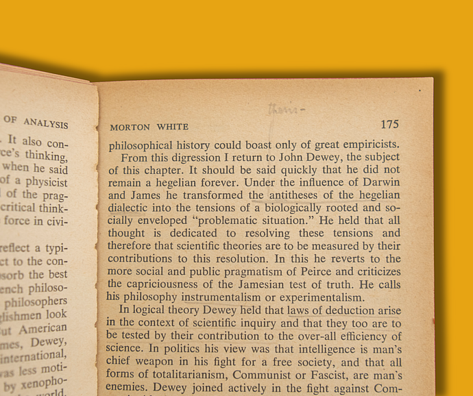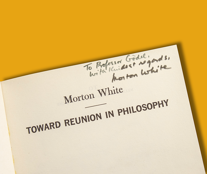 While finding Kurt Gödel’s annotations in mathematical texts is hardly surprising, his engagement with philosophical works offers a glimpse into the interactions between Institute scholars beyond the everyday conversation that one might expect—crossing paths at afternoon tea or sharing knowledge at one of the Institute’s many blackboards. Such is the case with his notes in Morton White’s Toward Reunion in Philosophy, where White—who served on the Faculty of the School of Historical Studies (1970–2016)—personally inscribed the title page to Gödel in pencil.