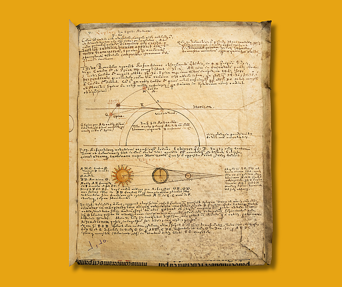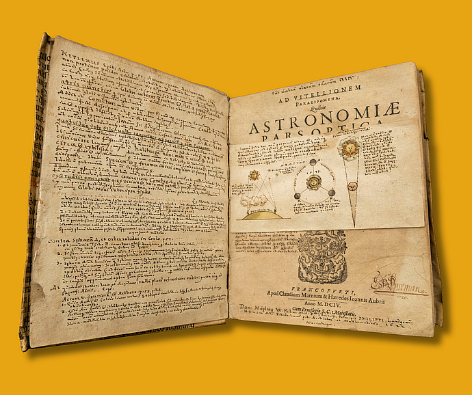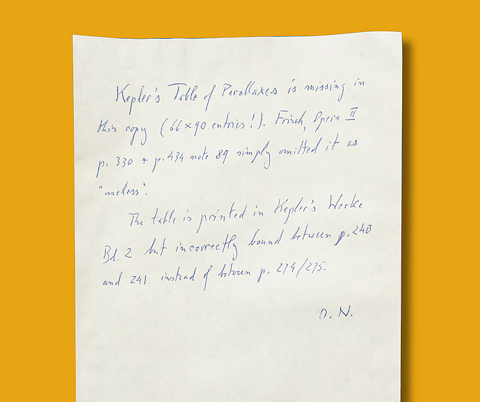 Alongside vivid illustrations of the solar system as it was understood in the early seventeenth century, the inside front and back covers of this edition of Johannes Kepler’s Ad Vitellionem paralipomena, quibus astronomiae pars optica traditvr (Supplement to Witelo, in which the Optical Part of Astronomy is Expounded) are filled with copious detailed annotations. In the back, some of these notes are faded, which could indicate that the page was washed to make space for new thoughts. In addition to the exquisite marginalia, a small sheet of paper tucked into the volume alerts future readers that this copy of the book is missing a table. The initials O. N. indicate that the note was written by mathematician-turned-historian of science Otto Neugebauer, a frequent Member of multiple IAS Schools, who contributed extensively to studies of the history of mathematical astronomy.