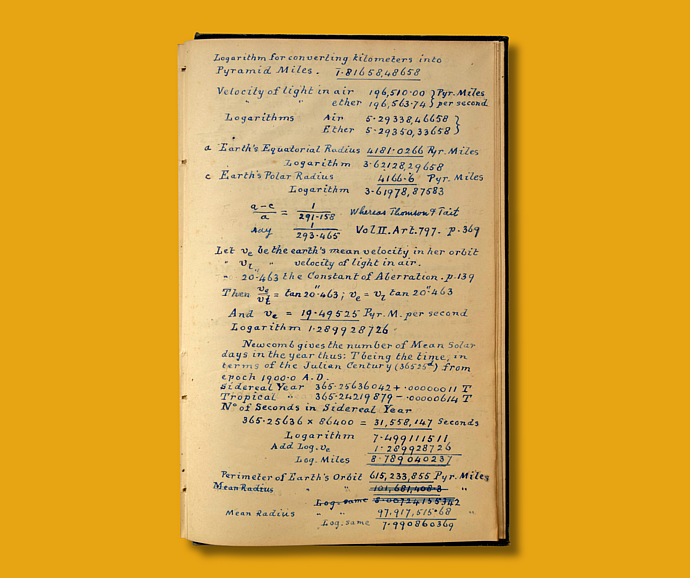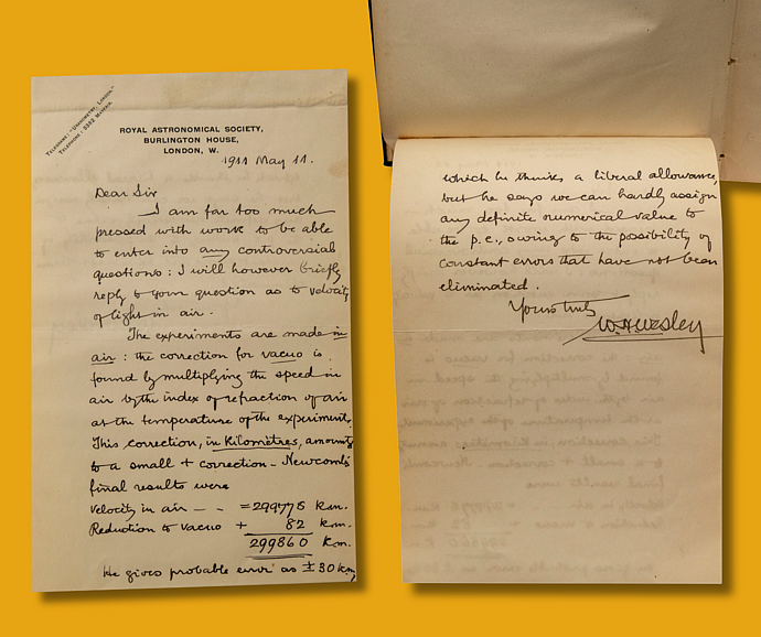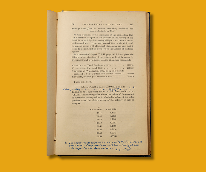 The pages of astronomer Simon Newcomb’s 1895 publication, The Elements of the Four Inner Planets and the Fundamental Constants of Astronomy, housed in the Institute’s rare book room, are filled with meticulously crafted logarithmic calculations. But most intriguing are the corrections to Newcomb’s calculations of light velocity in air, added by a subsequent reader. These amendments likely originated from correspondence found attached at the back of the book—possibly authored by William Henry Wesley of London’s Royal Astronomical Society—which appear to document discussions about the error between Wesley and the book’s owner.