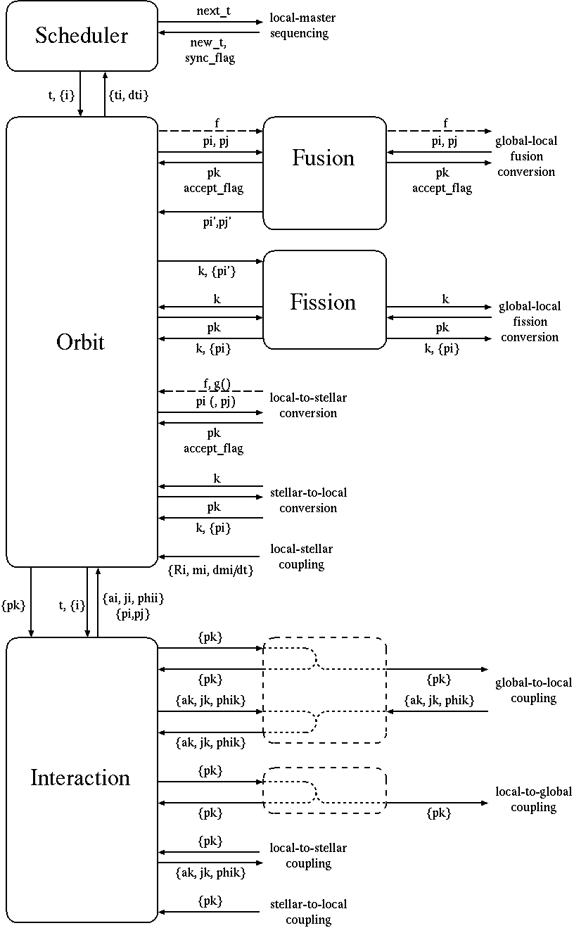 <- In June 2003, Jun Makino and I started the design of our Kali code, a new N-body code for modeling dense stellar systems. Unlike any previous N-body code with which we have experience, we have started our design fully top-down, by first developing complete specifications for all interfaces between the various modules, allowing swapping of individual modules (in the sample figure we show the five modules within the local stellar dynamics module, which itself is one of the four main modules of the code).