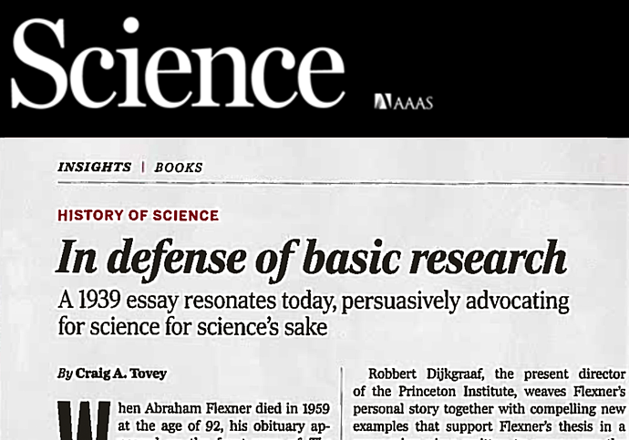 Craig A. Tovey of Science Magazine reviews The Usefulness of Useless Knowledge (Princeton University Press, March 2017) by founding IAS Director Abraham Flexner with a companion essay by current IAS Director Robbert Dijkgraaf. The book, Tovey writes, "makes a strong case for science done for science's sake," reflecting on Flexner's advocacy for "unfettered inquiry that, paradoxically and unexpectedly, has often resulted in extraordinary utility." Dijkgraaf's essay, Tovey writes, "weaves Flexner’s personal story together with compelling new examples that support Flexner’s thesis," including the World Wide Web, GPS tracking, and advancements in medicine.