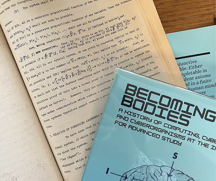 “Becoming Bodies: The History of Computing, Cybernetics, and Cyberorganisms at the Institute for Advanced Study” is on display in the Shelby White and Leon Levy Archives Center and the Mathematics-Natural Sciences Library in Fuld Hall until late April 2024. The exhibition is open to all members of the Institute community. Members of the public are also welcome. Please contact the Shelby White and Leon Levy Archives Center to arrange a visit.