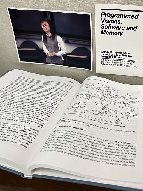 Following from this, another key document that brings the exhibition fully into the current moment is the work of Wendy Hui Kyong Chun, Member (2011–12) in the School of Social Science. Chun’s book Programmed Visions: Software and Memory is displayed as a counterpoint to the cohort featured in Bigelow’s papers by telling a story about the history of exclusion. In the book, Chun discusses the visibility and invisibility of race in the history of computing. Her work makes the point that although there are people of color in this story, their work tends not to have a theoretical focus. As a result, they are often unrepresented in the history of the discipline.