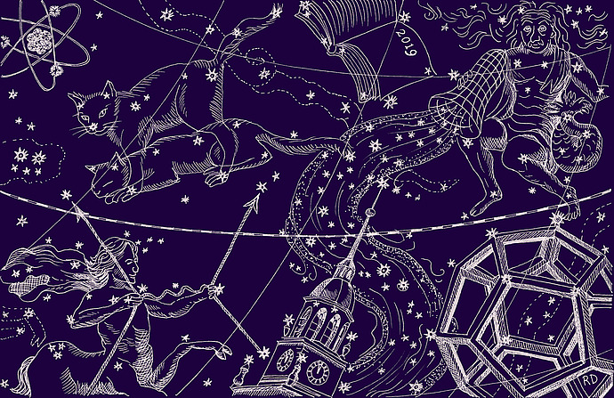 “The new constellations of 2019 include Schrödinger’s Cat(s), dangerously close to Atomium, Einstein as a cosmic Aquarius, Sagittarius firing his Feynman diagram, Leonardo’s quintessential Dodecahedron, and, of course, our beloved Institute.”