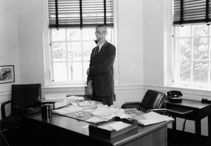 Robert Oppenheimer standing at his desk at the Institute for Advanced Study (undated)
