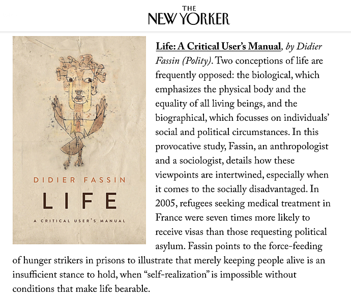 The New Yorker has featured Life: A Critical User's Manual, by Didier Fassin, James D. Wolfensohn Professor in the School of Social Science, among its "Briefly Noted" book reviews for the week of October 22.