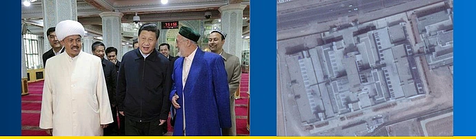 Iron fist: Chinese President shown with Uyghur officials during his first official trip in 2014, and satellite image of suspected Uyghur internment camp in Xinjiang
