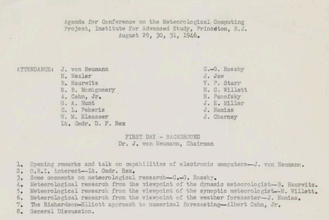 The Institute’s involvement with the advancement of climatology begins over seventy-five years ago. On August 29, 1946, IAS Professor John von Neumann welcomed a group of sixteen experts in the field of meteorology to the Institute campus. The attendees included two official representatives from the federal government: Lieutenant Commander D. F. Rex of the United States Department of the Navy Office of Research and Inventions, and Harry Wexler, Chief of the Scientific Services Division of the United States Weather Bureau (now the National Weather Service). The United States maintained an active interest in the work of the conference—bringing together a group of meteorologists and mathematicians that might be able to leverage von Neumann’s new Electronic Computer Project to create the first successful numerical predictions to forecast the weather.